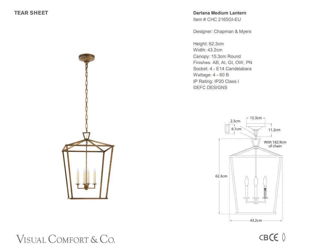 Height: 62.3cm Width: 43.2cm Canopy: 15.3cm Round Finishes: AB, AN, BZ Socket: 4 – E14 Candelabra Wattage: 4 – 60 B IP Rating: IP20 Class I Chain Length: 6′