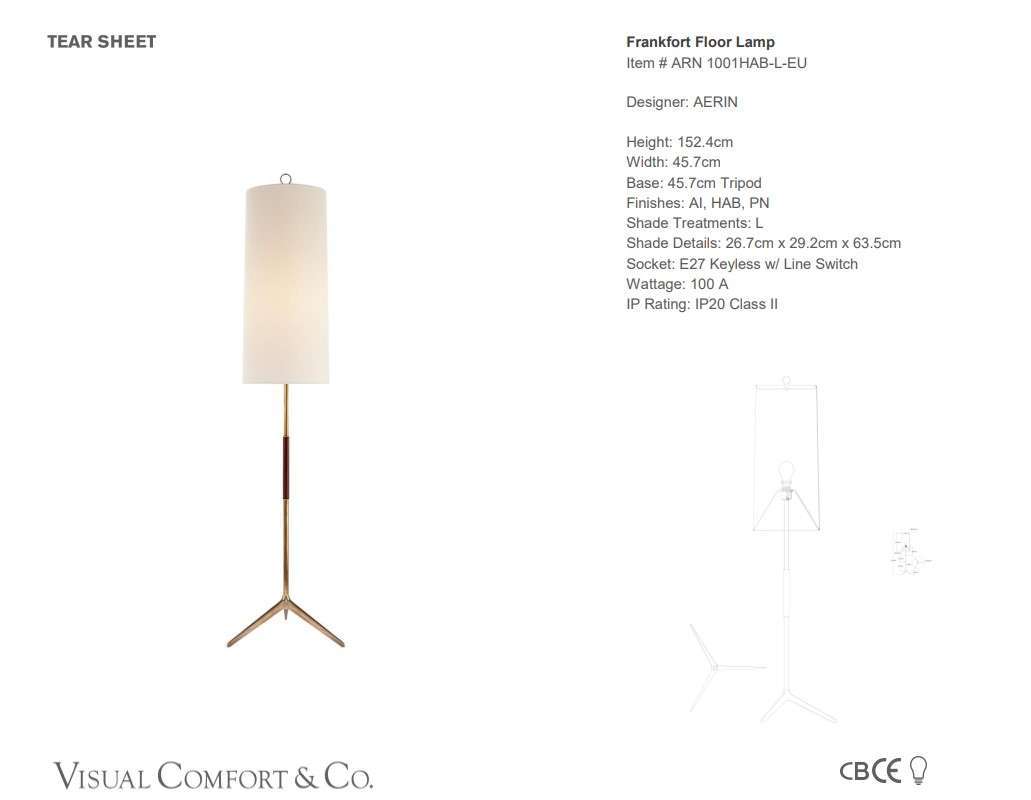 Discover the Frankfort floor lamp by AERIN for Visual Comfort – a sleek, modern design with hand-rubbed antique brass and timeless elegance.
