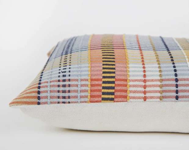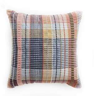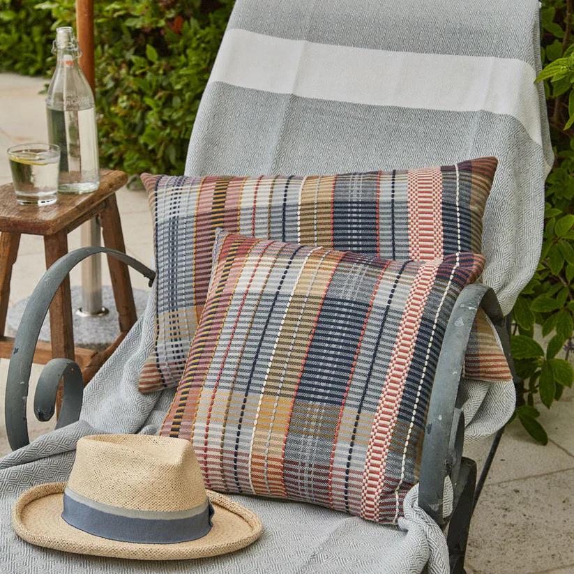 Madras pink check cushions in a soft recycled weave, perfect for indoors or out. Sustainable style in pink, yellow and blue, with inner included.