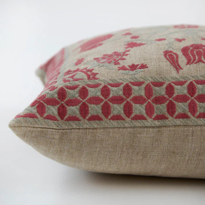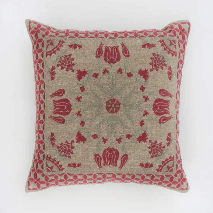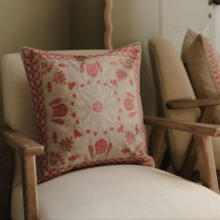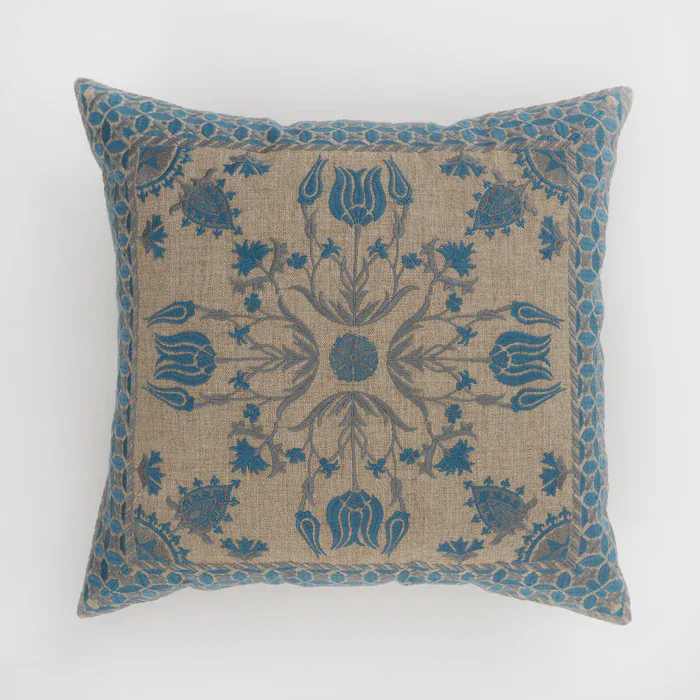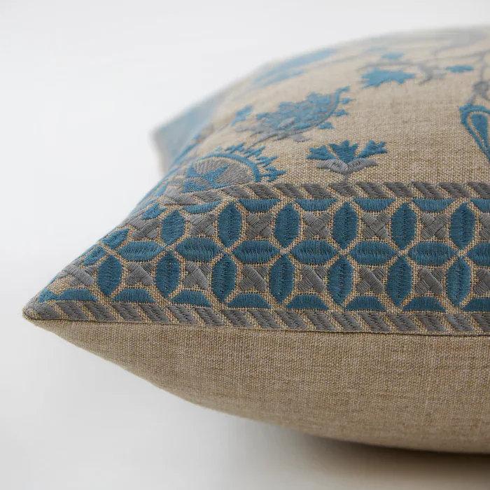 Tulip cushion in pink or blue, feature embroidered floral motifs on our brilliant new linen feel fabric made entirely from our recycled PET wonder yarn.